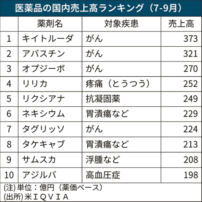 医薬品の国内7 9月 キイトルーダ好調 日本経済新聞