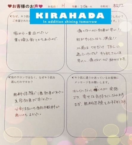 キラ肌 松江30代h様のお声 痛くないのに効果が早い 美容脱毛サロン キラ肌 松江店のニュース まいぷれ 松江