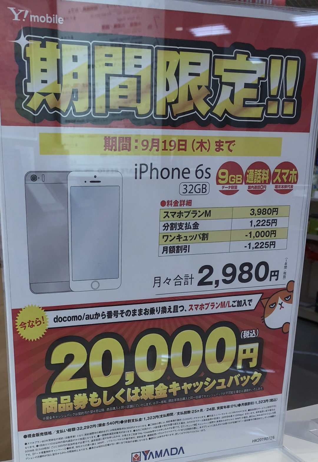 ヤマダ電機でワイモバイルのiphone 6sの32gbがmnpで2万円キャッシュバック 9 19 木 まで